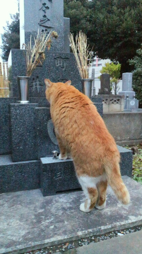 墓の水を飲む猫さん。