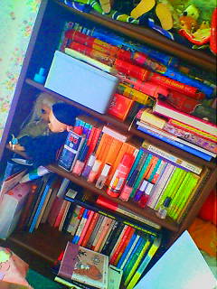 許可は貰ったが・・親も本好きなので、巨大スライド式本棚には本がぎっしり。